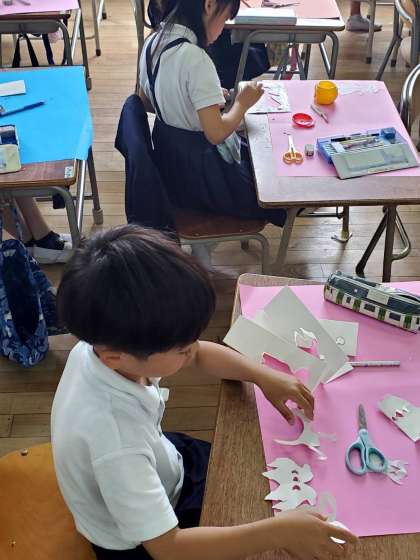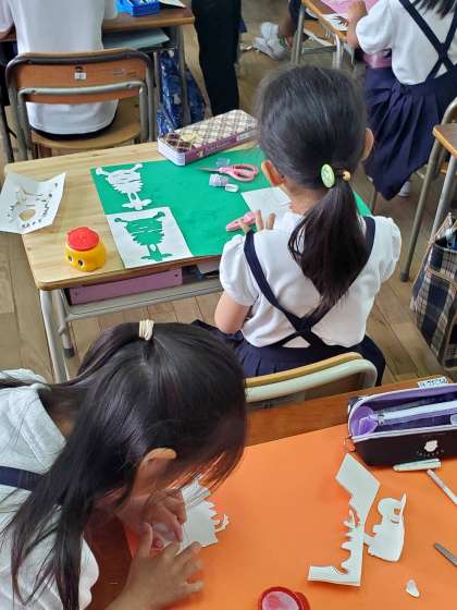 同じく3時間目、2年生が自分で考えた宇宙人をはさみで切り出し、画用紙に貼っていました。面白い作品ができ上がりそうです。