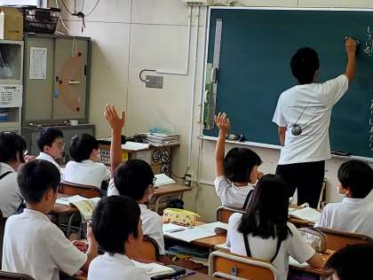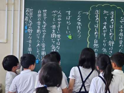 今日の4時間目、5年生の教室で国語科(「世界で一番やかましい音」)の公開授業が行われました。