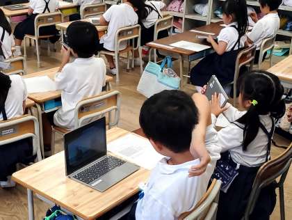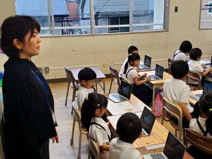ご覧の写真は1年生がタブレットを使う学習を行っている様子です。今日はICTサポーターの山口先生にもお手伝いいただきながらがんばりました。