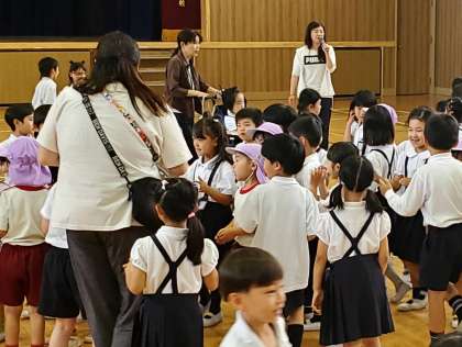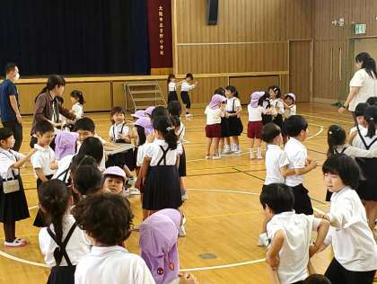 音楽に合わせて自己紹介をしたり、ゲームをしたりして交流しました。今度は1年生が幼稚園を訪問させていただきます。どうぞよろしくお願いいたします。