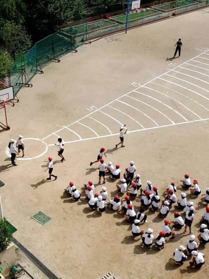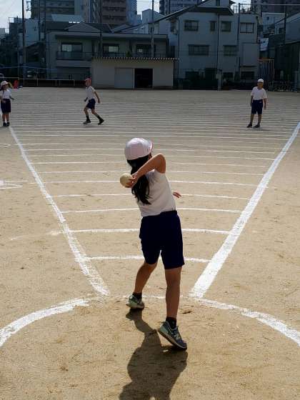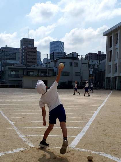 今日は主にソフトボール投げを実施する日に設定しています。ご覧の写真は4年生が投げている様子です。