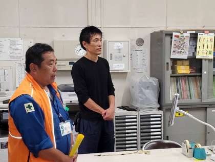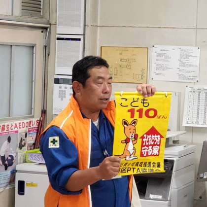 今日の全校朝会では、まず区役所防犯担当の親川さんより、活動の紹介や子ども110番の家などについてのお話がありました。