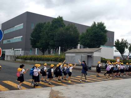 今日は4年生が柴島浄水場に社会見学に出かけています。午前9時半、予定どおりの時刻に到着しました。