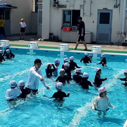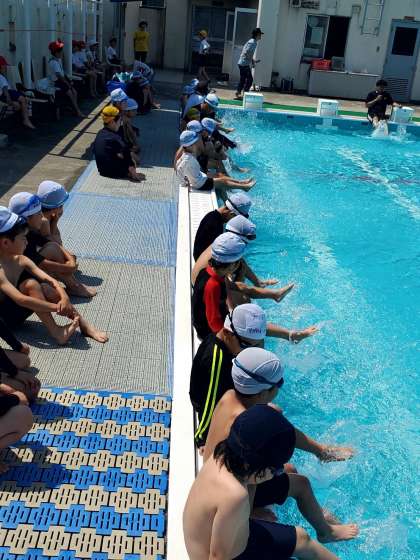 今日は吉野小学校のプール開きの日でした。ご覧の写真は1年生の様子です。小学校で初めてのプールでしたが、水を怖がることもなく、楽しそうに活動する姿に感心しました。