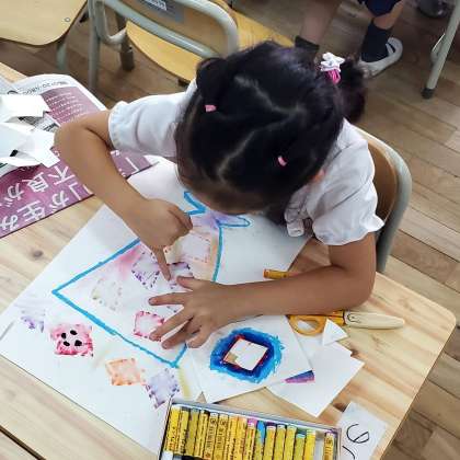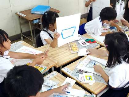ご覧の写真は今日の3時間目、1年生が昨日の参観の続きの図工の学習をしている様子です。好きな形のグラスを描き、その中に思い思いの具材を入れて、カラフルなパフェを完成させました。どの作品もとっても美味しそうです。