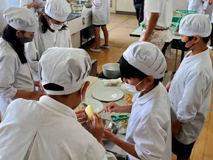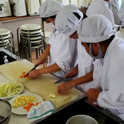 今日は2組が若野先生に教えていただきながら、調理の実習をしています。がんばっている姿、協力する姿がたくさん見られました。