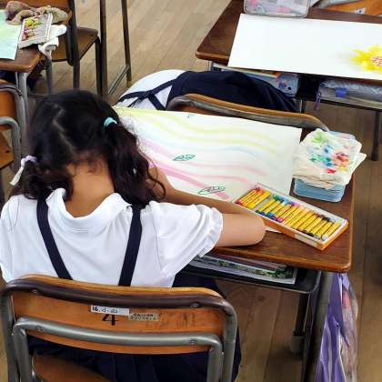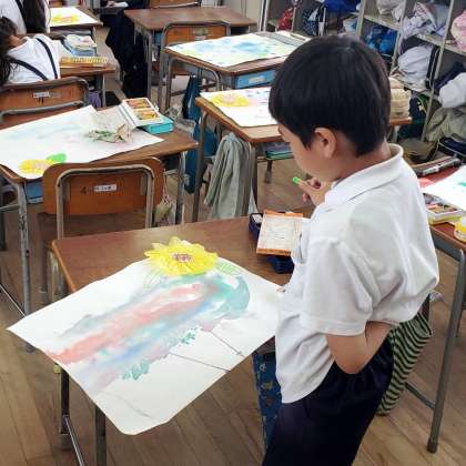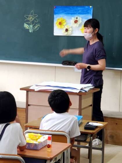 今日の2時間目、3年生が図工の学習をしている様子です。にじみやぼかしの技法を使って色とりどりの背景を描いた上に、ひまわりの花を付けていきました。夏らしい素敵な作品ができ上がりました。