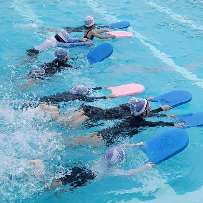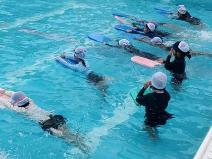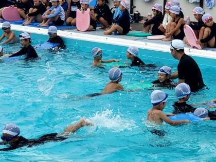 ご覧の写真は今日の2時間目、1年生がプールで水遊びをしている様子です。すっかり水に慣れて、けのびなどの練習を始めるまでに上達しました。