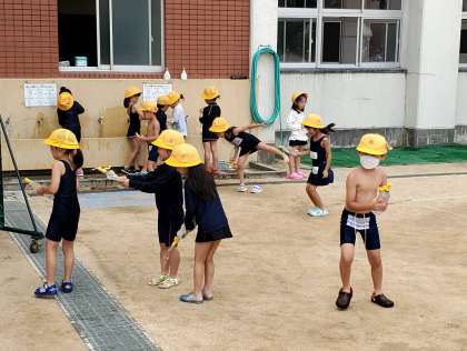 今日の1時間目、1年生が運動場で水遊びをしている様子です。楽しそうな声が学校中に響いています。