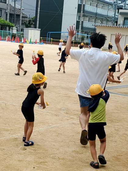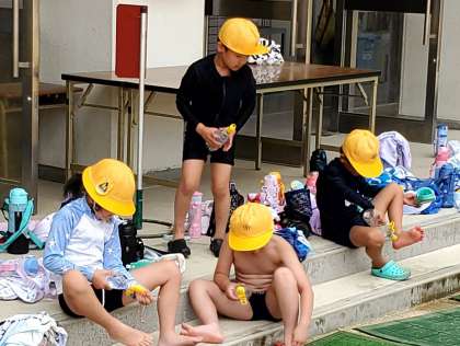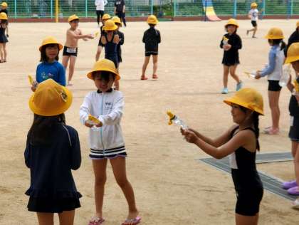 担任の先生も水鉄砲の犠牲者に(笑)。泥だらけになったこどももいましたが心配ご無用、2時間目はプールです。