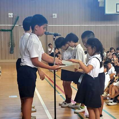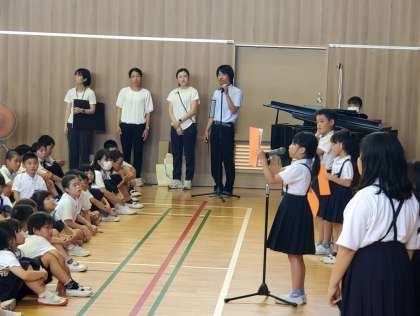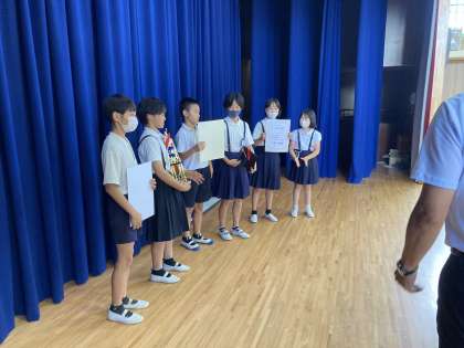 5時間目は講堂で終業式を行いました。暑かったので校歌は1番だけ歌うなど、短縮バージョンで。その中で、2・4年生による1学期の思い出の発表、ジュニアバレーボールクラグの表彰や図書委員会からの本をたくさん借りたクラスの紹介などを行いました。