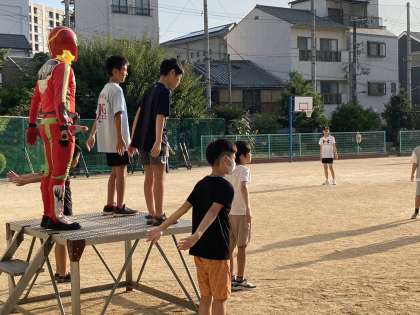 今日はラジオ体操最終日。早朝にもかかわらず、トマト刑事トマティーンさんが吉野小学校に来てくれました。