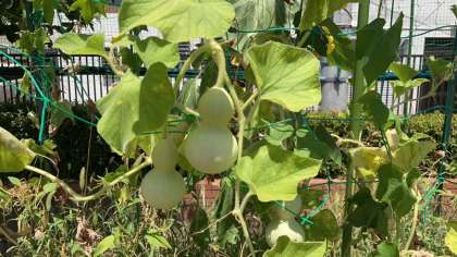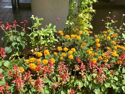 ご覧の写真は玄関と学習園の様子です。学習園ではかわいらしいひょうたんの実ができてきています。また玄関先では夏の花の定番、マリーゴールドやサルビアをはじめ、フウセンカズラやセンニチコウなどが来校される方々をお出迎えしています。