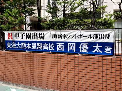 昨日から甲子園球場では夏の高校野球が始まりました。その中で、 吉野新家ソフトボール部出身の生徒も出場すると言う事で、校門の左側に応援の横断幕がはられました。ぜひみんなで応援しましょう!