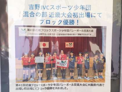とっても嬉しいお知らせです。吉野ジュニアバレーボールクラブがスポーツ少年団主催の近畿大会で見事ブロック優勝の栄冠に輝きました!