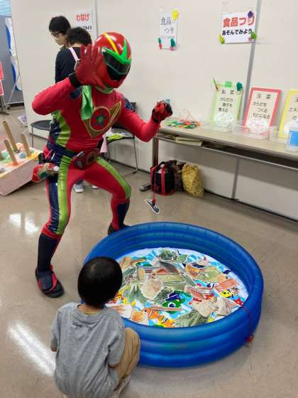 昨日から福島区役所で行われている食育なつまつり。今日はトマト刑事トマティーンをはじめ、様々なキャラクターが遊びに来てくれているようです。