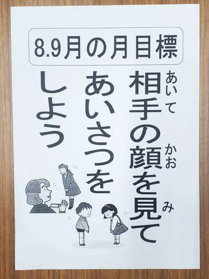 8・9月の月目標は「相手の顔を見てあいさつをしよう」です。ぜひ、お家の人や近所のおじさん、おばさん。またお友達や先生方とあいさつをする時など、しっかりと意識して気持ちのよいあいさつが出来るようになってほしいと思います。