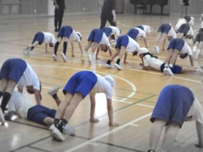 ご覧の写真は3年生が体育の学習をしている様子です。屋内とは言え、まだまだ暑いので大型扇風機や冷風機をフル稼働させながらがんばっています。