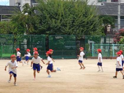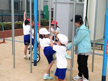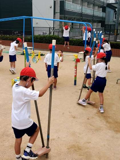 1年生が運動場で体育の学習をしている様子です。のぼり棒や鉄棒、また一輪車や竹馬など、様々な運動遊びに取り組んでいました。