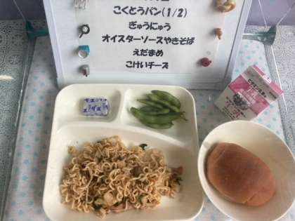 2学期の給食が始まって三日目、今日の給食は「焼きそば、えだまめ、固形チーズ」でした。今日の焼きそばは、オイスターソースで味つけしていました。来週の焼きそばは、ソース味です。お楽しみに!