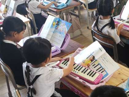 今日の2時間目、1年生が鍵盤ハーモニカの練習をしている様子です。色々なところを押さえてどんな音がするか確かめたり、それぞれが何の音を表現しているか当てっこをしたりして楽しみました。