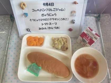 今日の給食は「豆乳マカロニグラタン(米粉)、トマトスープ、みかん(缶)」でした。今日のグラタンは、乳アレルギー・小麦アレルギーの児童に配慮し、牛乳のかわりに豆乳、マカロニとパン粉は米粉でできたものを使用しました。味つけのアクセントにカレー粉を使用し、おいしくできあがりました!