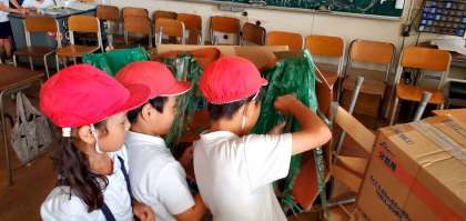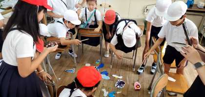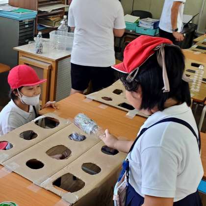 上からトレジャーハンター(5年2組)、もぐらたたき(5年1組)、魚つり(4年2組)のコーナーです。今年は暑いので、すべてエアコンのきいている教室で行いました。