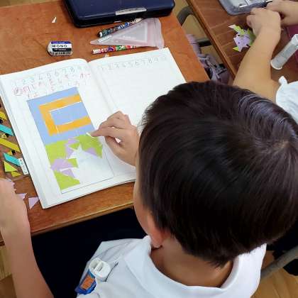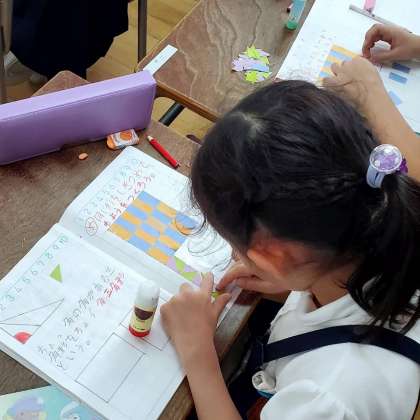 ご覧の写真は2年生が算数の学習をしている様子です。三角形や四角形を敷き詰めて思い思いの模様を作っています。それぞれの個性がよく出ていて面白いです。
