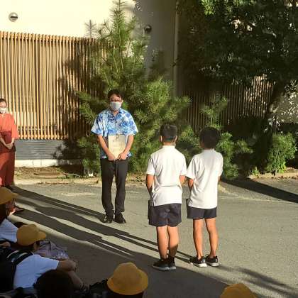 午後4時20分、志摩ビーチホテルに到着。早速玄関前で開舎式を行いました。