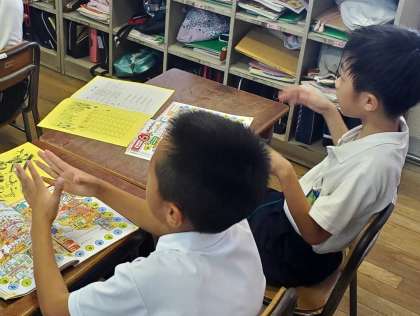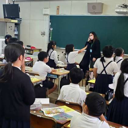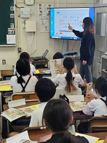 4年生がCーNETのミレー先生に英語を教えていただいている様子です。今日はアルファベットについて学んでいました。楽しそうな声が教室に響きわたっていました。