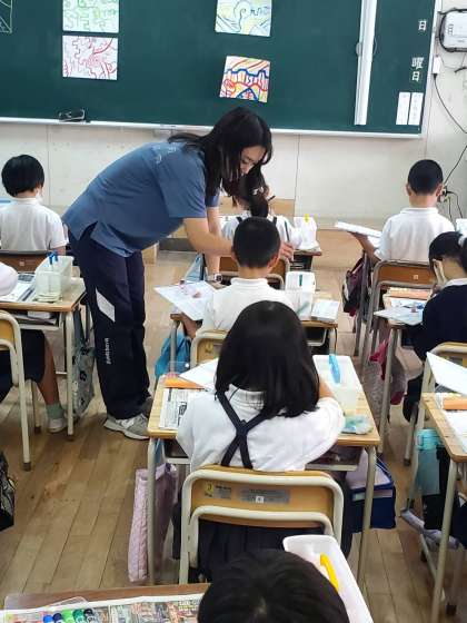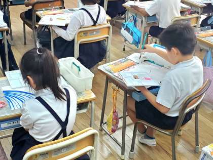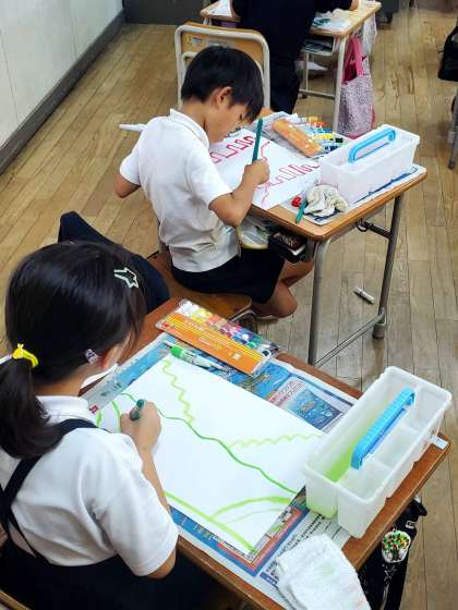 今日の3時間目、2年生が図工の学習をしている様子です。絵の具の使い方の基本を学びながら、思い思いの色で線を描いていました。どんな作品が出来上がるか楽しみです。
