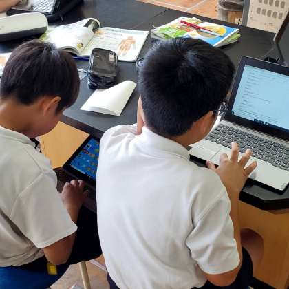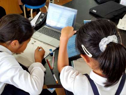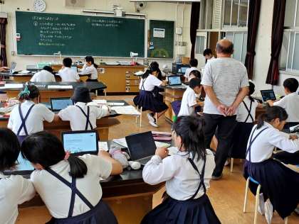 今日の5時間目、5年生が理科の学習をしている様子です。タブレットを使って動物の体の仕組みについて調べています。友達と相談したりしながら上手に調べることができています。
