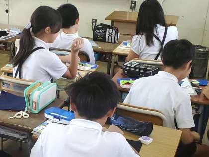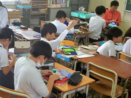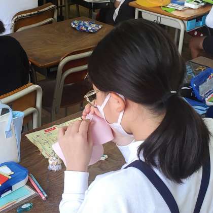 ご覧の写真は5年生が小物づくりに取り組んでいる様子です。慣れない手つきで苦戦している子どももいますが、教え合いながらがんばっていました。
