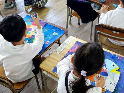 1年生が図工の学習をしている様子です。カラフルな魚が完成に近づいてきています。みんなしっかり色を塗り込むことができていて、とてもきれいです。