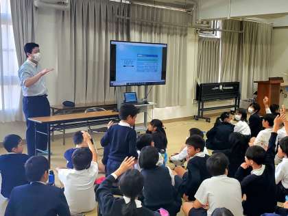 今日の3時間目、多目的室において6年生が福島警察署の方を講師にお招きして、非行防止教室の講義を受けている様子です。