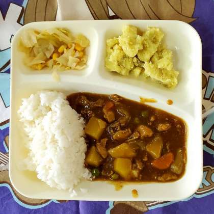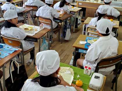 給食時の様子です。今日はご覧のように2年生だけ1品多い給食です。