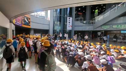 今日は4年生が社会見学に出かけています。午前9時半、大阪市立科学館に到着しました。今からグループに分かれて見学します。