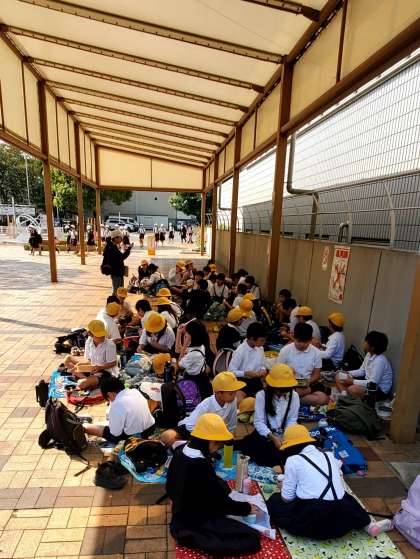 お昼になりました。科学館を出たところでお弁当を食べています。この後、実験ショーを見せていただく予定です。