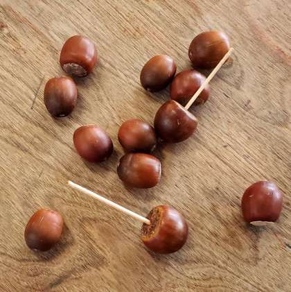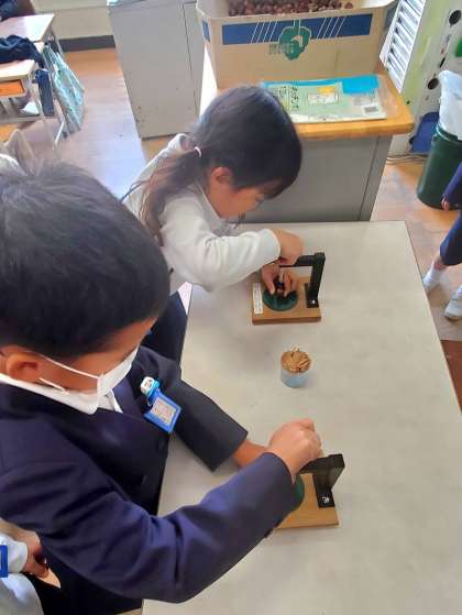 今日の3時間目、1年生が金曜日の遠足で集めてきたどんぐりを使って、独楽を作っていました。機械で上手に穴をあけるのが少し難しかったようですが、先生に手伝ってもらいながらがんばっていました。