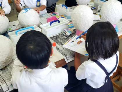 今日の5時間目、3年生が図工の学習をしている様子です。風船に紙粘土を張り付けてご覧のような卵状のものを作っています。さてどんな作品が出来上がるのでしょうか?