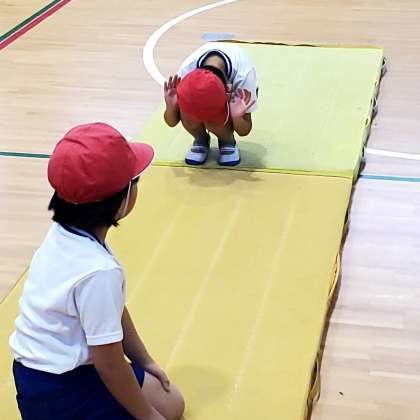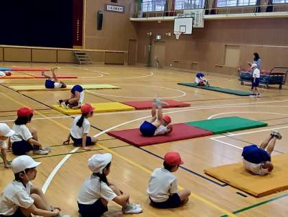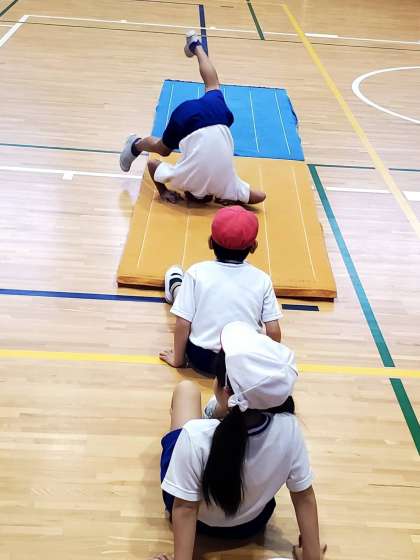 今日の1時間目、2年生が体育館でマット遊びをしている様子です。上手に回ることができる子もそうでない子もそれぞれにがんばって練習していました。