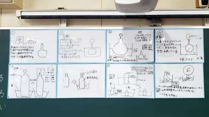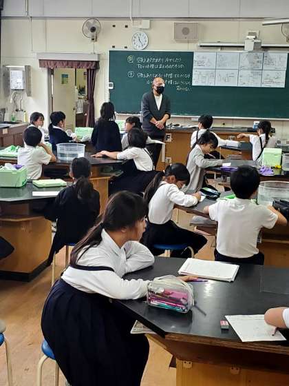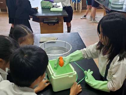ご覧の写真は今日の3時間目、4年生が理科の学習をしている様子です。本時は空気を温めたり冷やしたりすると体積がどう変わるかを予想し、実験して確かめました。