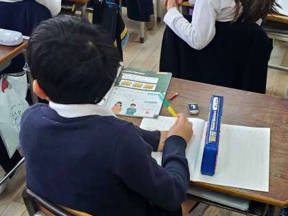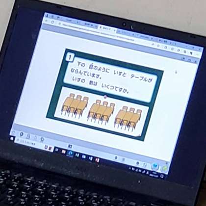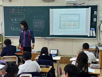 今日の3時間目、2年生が算数の学習をしている様子です。本時はご覧のような椅子の数を、かけ算を使って求める方法を考える勉強をしていました。
