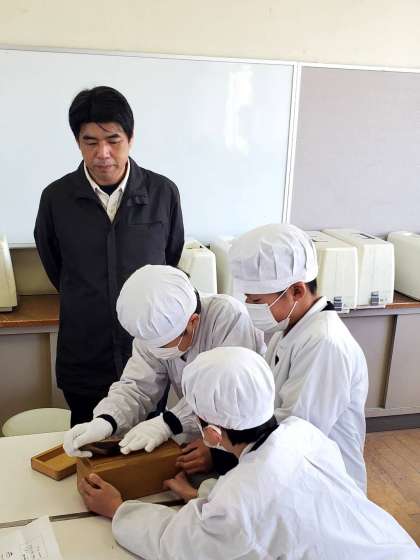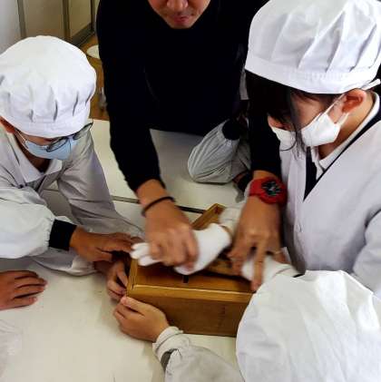 今日は2組の番です。ご覧の写真は2時間目の様子です。講師の先生に教えていただきながら、がんばってかつお節を削っています。