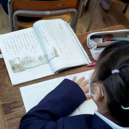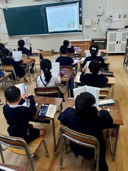 一方こちらは2年生の別のクラスの5時間目の様子です。ご存知のがまくんとかえるくんが登場する「お手紙」の学習をしています。集中してがんばっています。
