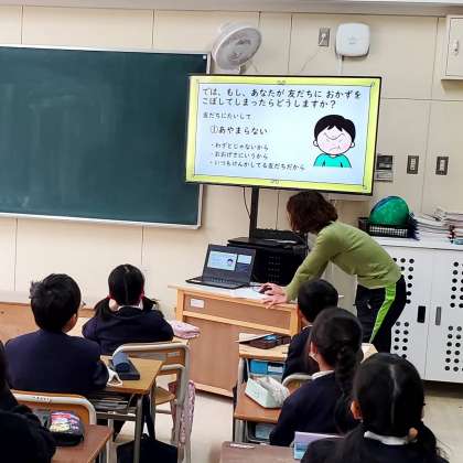 給食がこぼれて人にかかってしまった場合、どんな言葉をかけるか、またどんな気持ちになるかなど、友達同士、意見を交流させながら考えました。