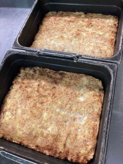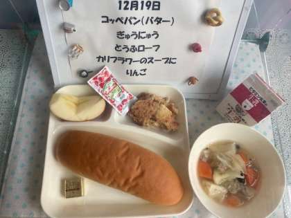 今日の給食は「とうふローフ、カリフラワーのスープ煮、りんご」でした。とうふローフは新メニューです。ツナ、とうふ、たまねぎ、粒状の乾燥大豆を混ぜ合わせて、グラタンのように焼き物機で焼いています。ローフはかたまりという意味があるそうです。