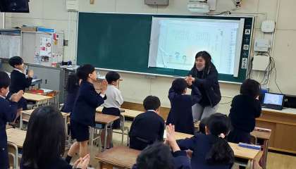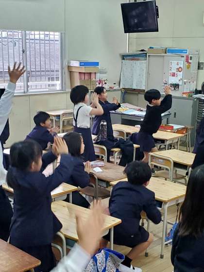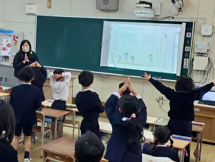 ご覧の写真は今日の3時間目、1年生が国語の学習をしている様子です。詩に書かれている内容を動作化して読み味わっていました。