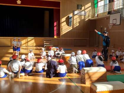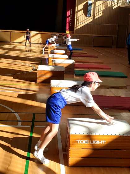 今日の5時間目、3年生が体育館で跳び箱運動をしている様子です。