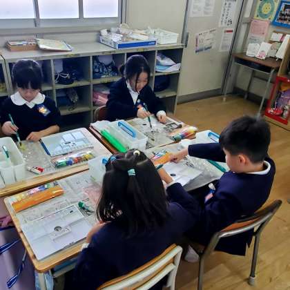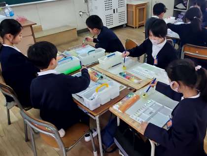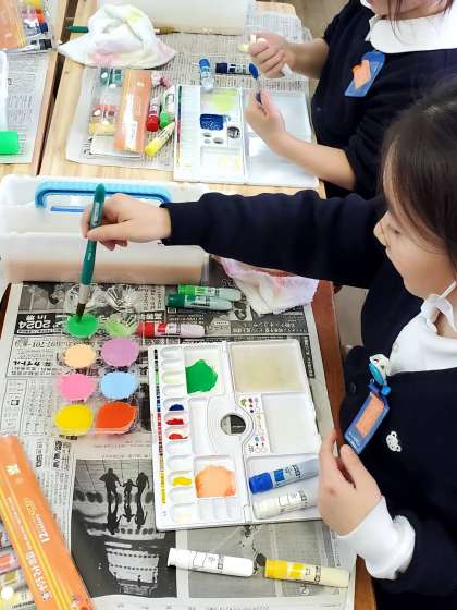 今日の5時間目、2年生が色水あそびをしている様子です。自分の好みの絵の具を出し、混ぜ合わせるなどしてたくさんの色を作りました。